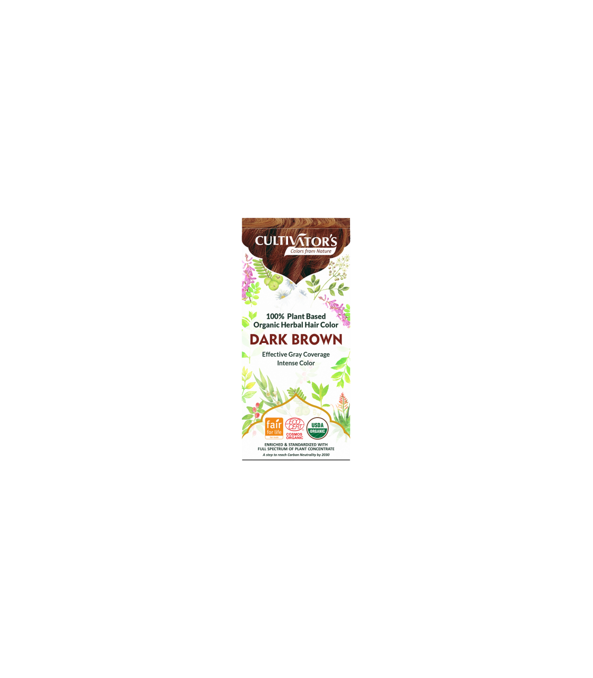Cultivators Tinte Vegetal Orgánico certificado por ECOCERT de color castaño oscuro. Es una coloración orgánica o natural, que cubre las canas al 100% para mujeres y hombres.